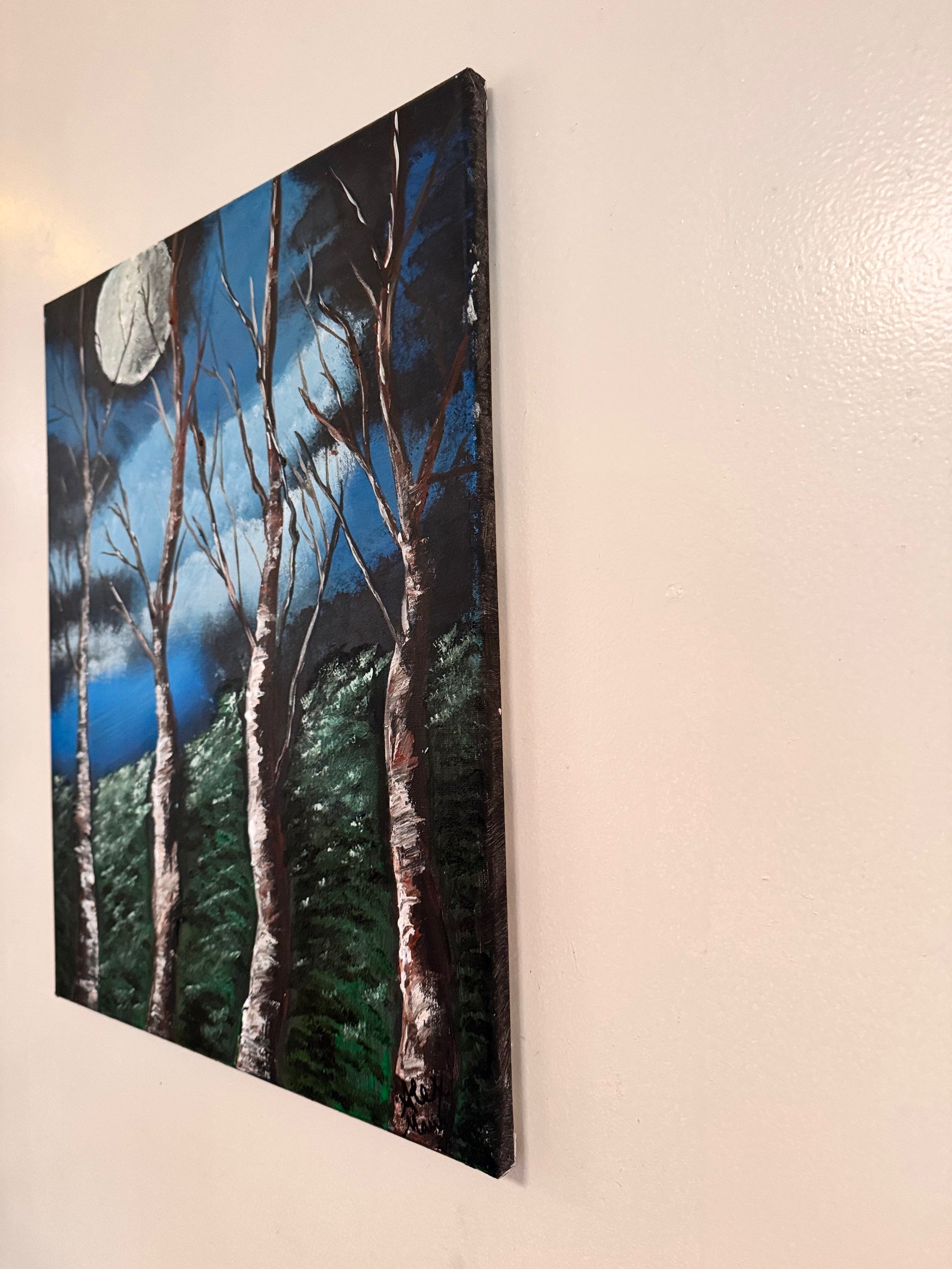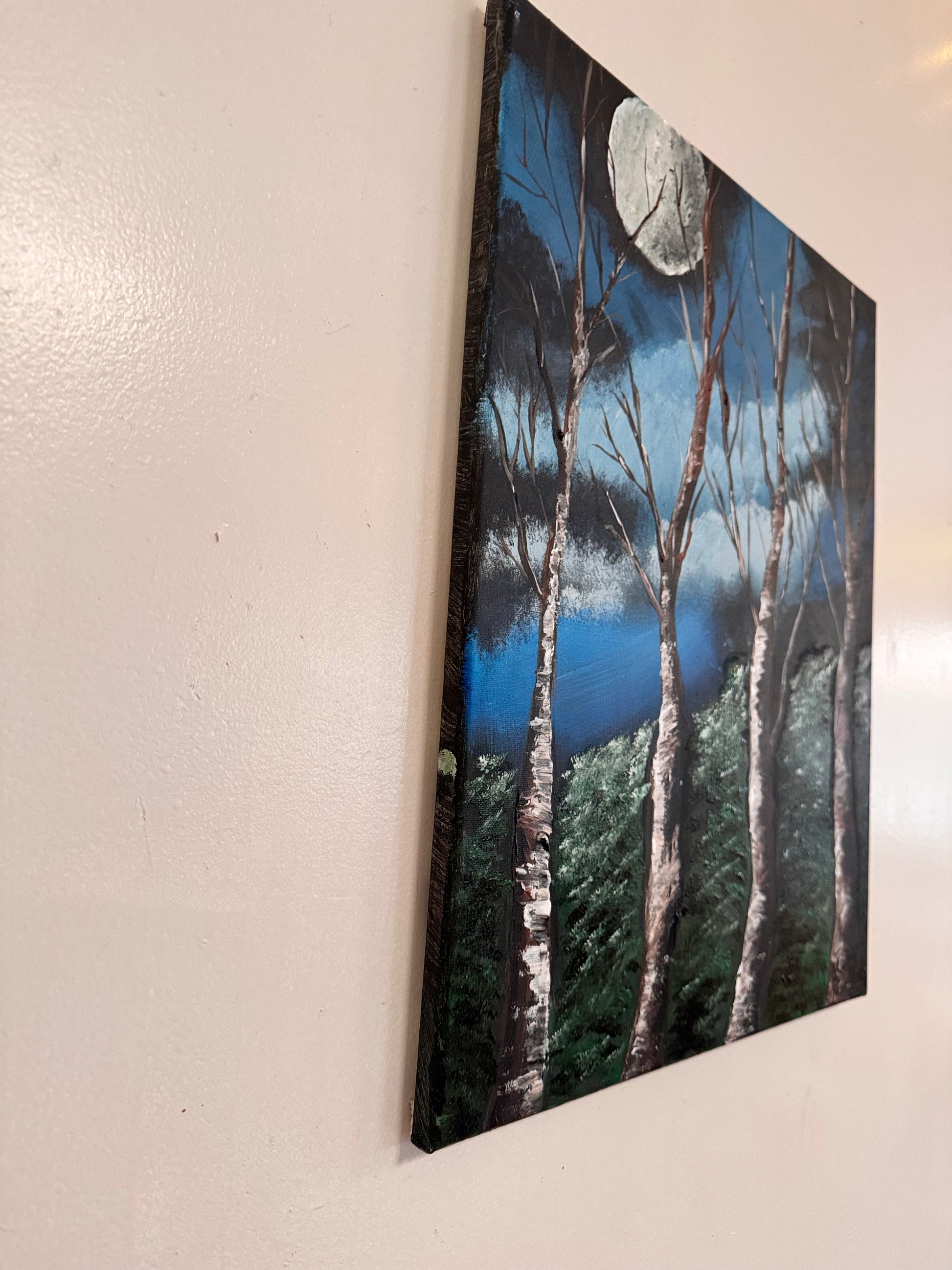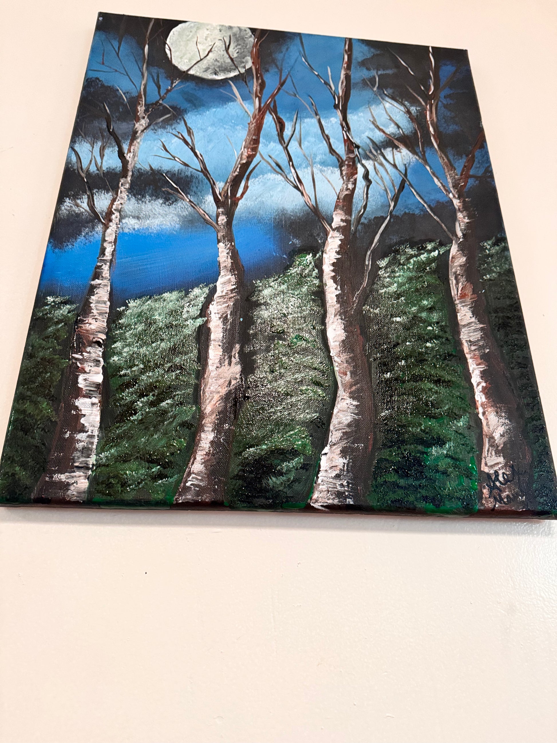 Original Textured Acrylic Painting of a moon landscape with whispering trees. Finished painting on a stretched 20x16 inch canvas.